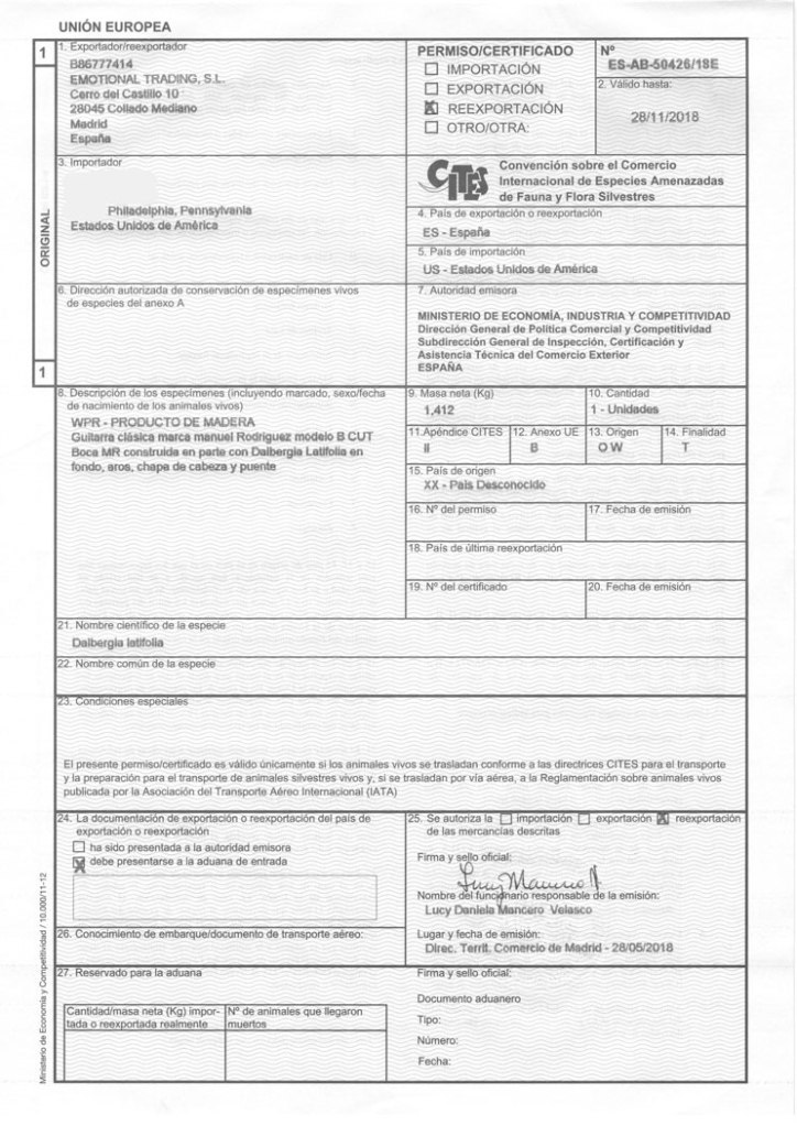 - A guitar that has been manufactured in another country, forexample in Spain, with Dalbergia wood from Mexico.
