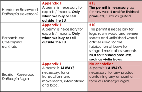 Several of the species that are commonly used in guitar construction are in the CITES appendices, and some of them have different annotations.