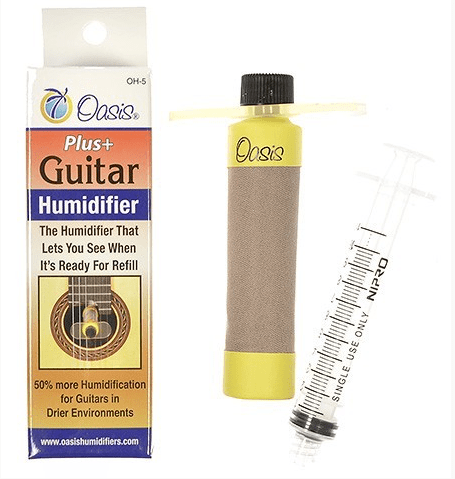 The Oasis OH-5 Humidifier hangs in the sound hole of the guitar, safely and easily humidifying the instrument without actually touching the sides. And it lets you see when it needs a refill. Just like your uncle.