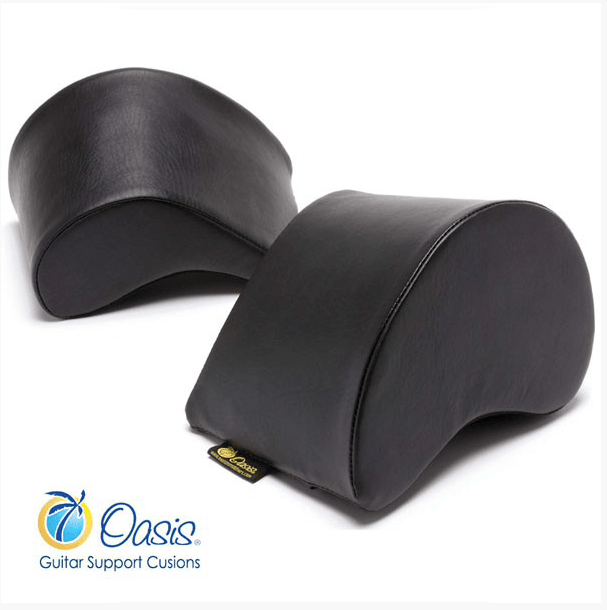 One of the simplest kinds of guitar support that works well is the cushion. It easily rests on your thigh and helps you to maintain good posture whilst seated. Oasis make a large and small model: the Oasis OH-28 (large) guitar support cushion raises the height of the guitar by around 5.5″ (14 cm), whilst the Oasis OH-29 (small) guitar support cushion raises it by about 4″ (10.16 cm).