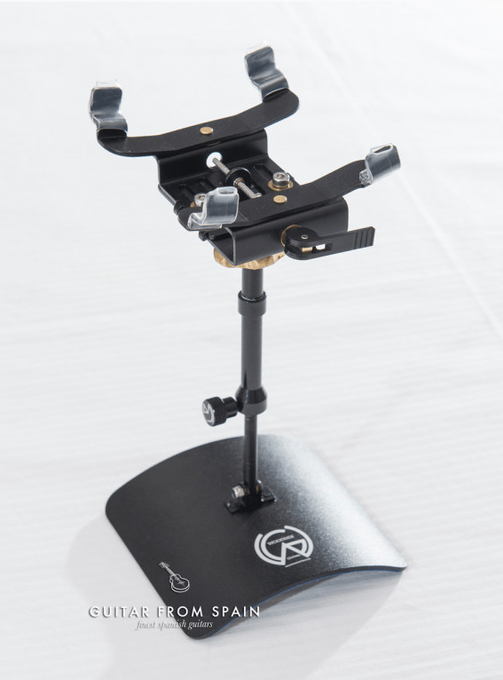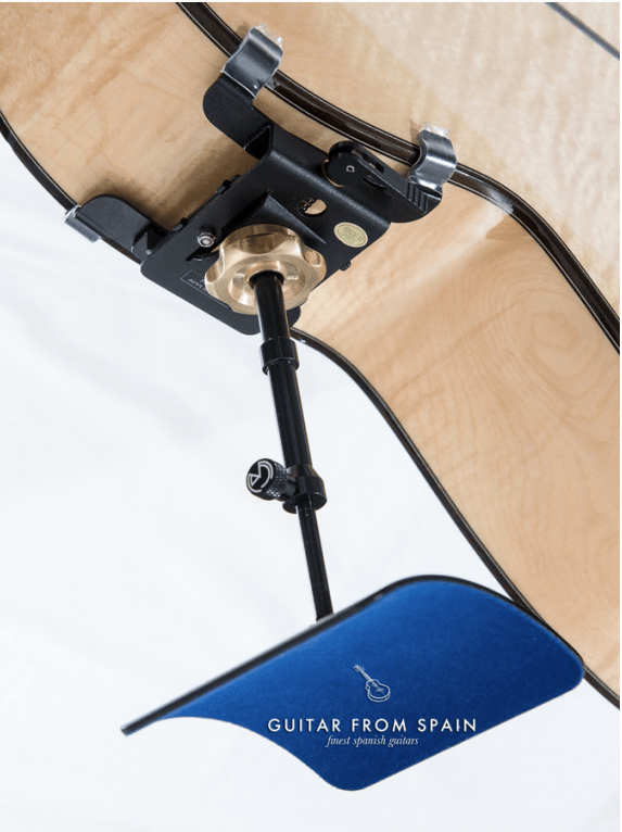 A second simple option is the Alhambra Gitano guitar stand. Designed for the classical guitar, flamenco guitar, acoustic guitar, and other stringed instruments, this compact and minimal stand folds down, so it’s easy to carry around. And even more importantly, it reduces stress on the back by helping you maintain a more ergonomic playing posture. Where you position the two suction cups on the guitar enables you to adjust the angle of the instrument to your liking.