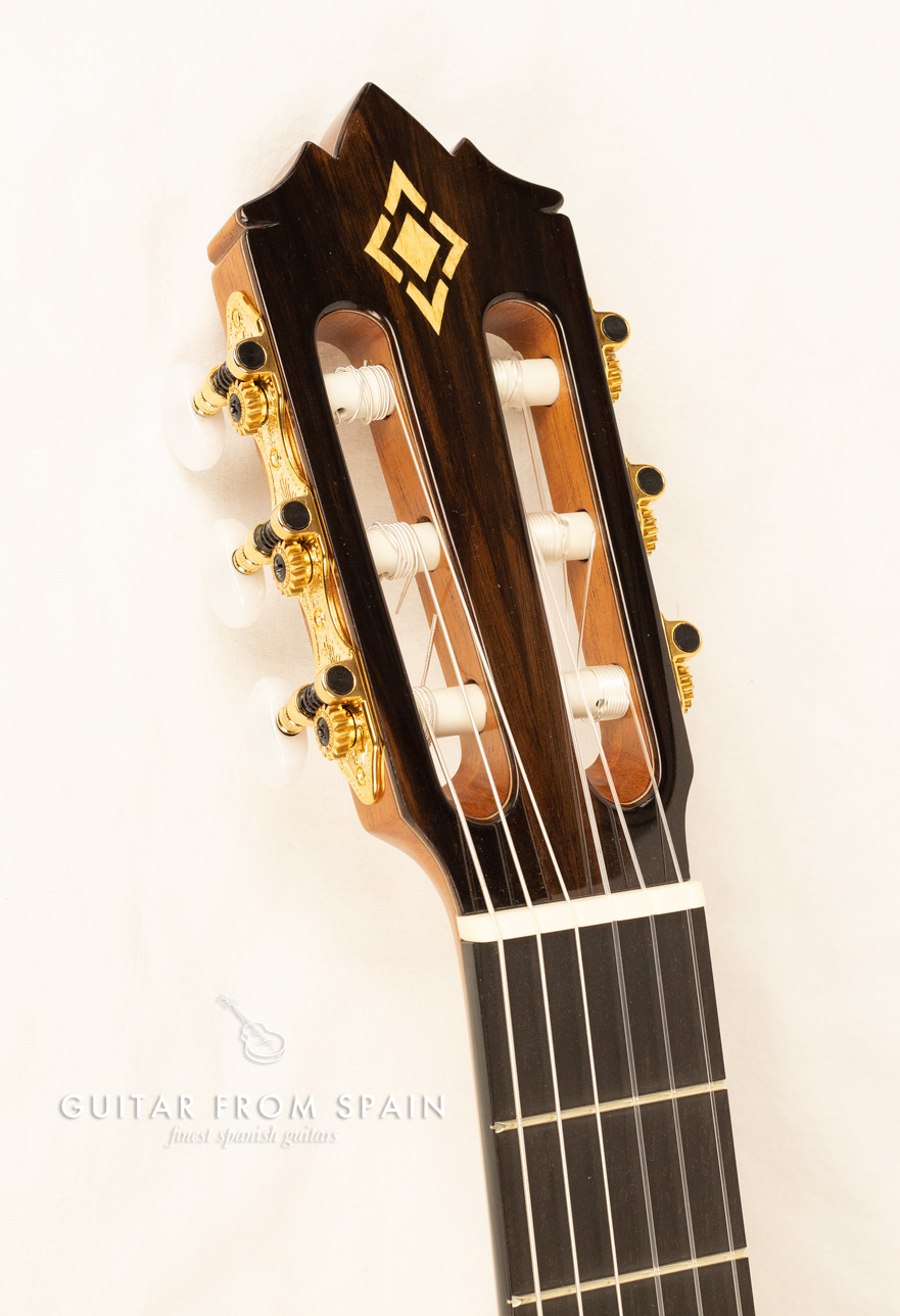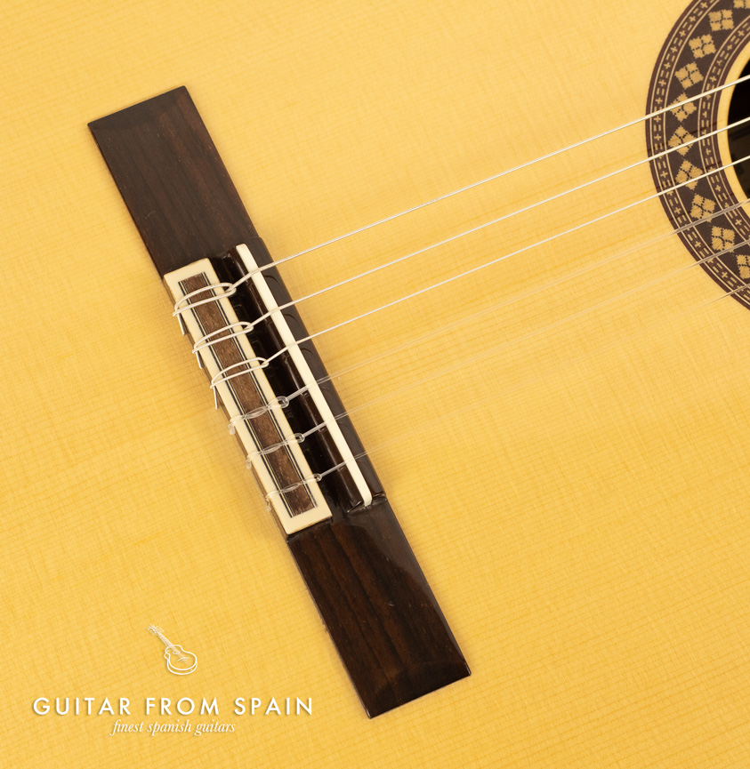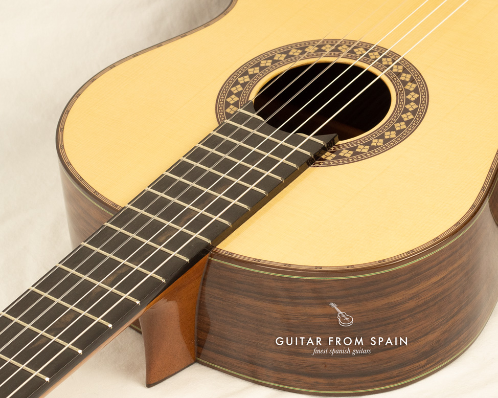 Along with every other model in the Burguet catalogue, the Amalio Burguet Vanessa with spruce top is made of the finest all solid woods, and entirely by hand: an Indian rosewood back and sides, African ebony fretboard and cedar neck with ebony strip reinforcement. These are first meticulously selected, then subjected to a painstaking drying process under carefully controlled humidity and temperature conditions. After some twenty years, they acquire the ideal humidity levels associated with optimal tonal quality and stability. Only then are they cut and shaped, assembled and then varnished, to become, as Amalio Burguet poetically puts it, the very ‘soul’ of the guitar.